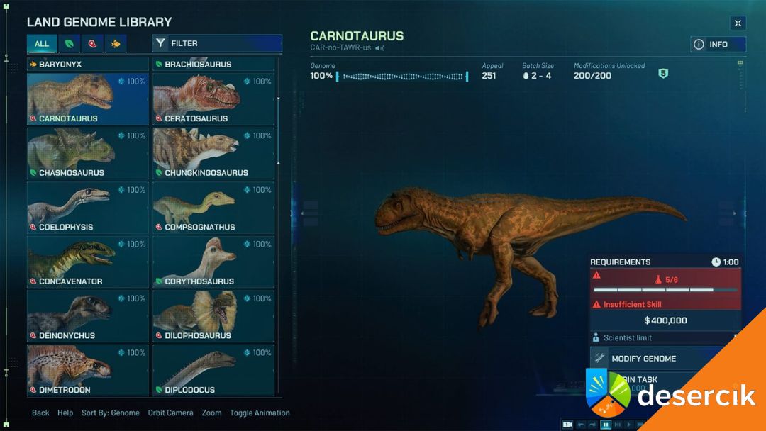 Twój park zyska na atrakcyjności, jeśli będzie pokazywał gościom wiele gatunków dinozaurów. Wysyłaj naukowców na ekspedycje, żeby odkrywać nowe DNA i uzupełniać Genome Library.