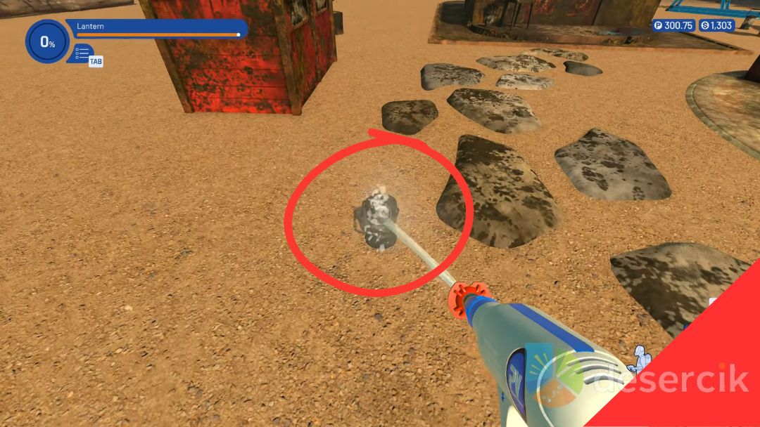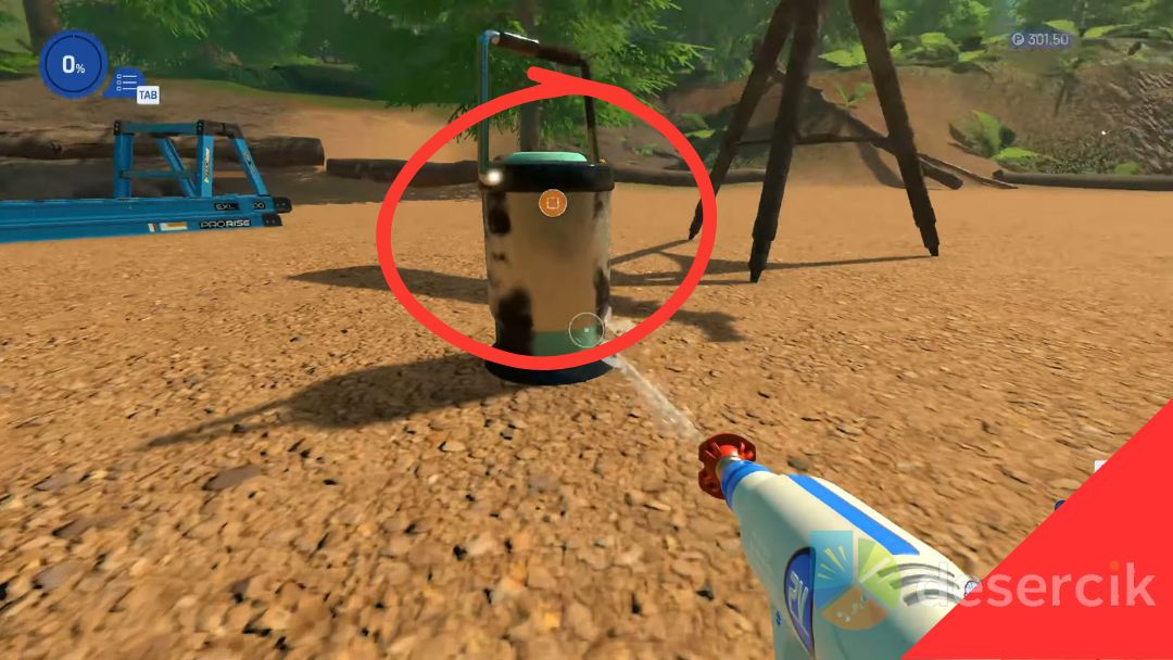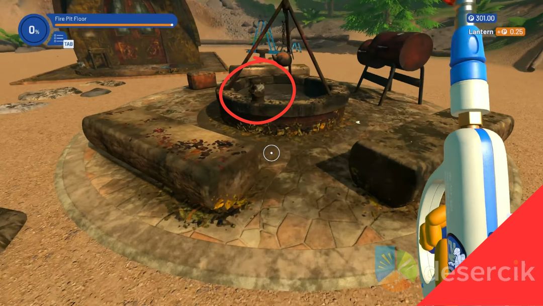 Kiedy już znajdziesz się na mapie kempingu, zacznij od pierwszej lampy stojącej przy czerwonym koszu, po lewej stronie ogniska. To miejsce łatwo rozpoznać – jest tam trochę śmieci, kilka plam błota i charakterystyczny czerwony pojemnik. Upewnij się, że masz aktywną czerwoną dyszę i dokładnie omiataj lampę od góry do dołu. Postęp czyszczenia zobaczysz na pomarańczowym pasku w lewym górnym rogu ekranu, który pokazuje, ile jeszcze brudu zostało do usunięcia.