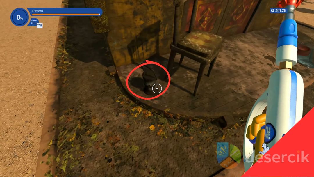 Trzecią lampę znajdziesz przy małej chatce, obok drewnianego krzesła. To miejsce potrafi trochę zmylić, bo w jego pobliżu znajdują się dwie bardzo podobne lampy – jedna stoi na ziemi przy fotelu, a druga wisi przy wejściu do budynku. To właśnie tu wielu graczy popełnia błąd. Jeśli przypadkiem spryskasz tę wiszącą lampę, gra uzna, że naruszyłeś warunki wyzwania i całe osiągnięcie przepadnie. Dlatego pamiętaj: czyścisz tylko lampę przy krześle – żadnej innej!