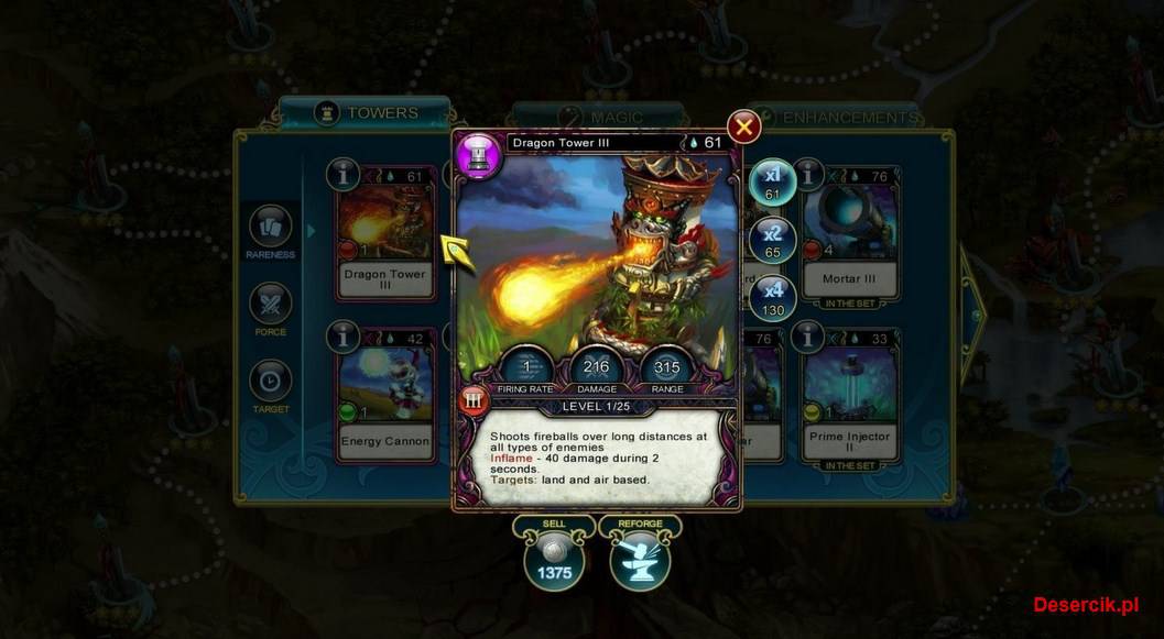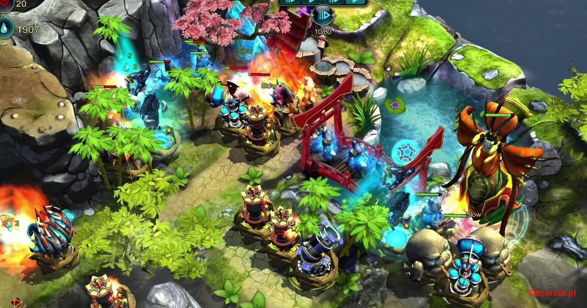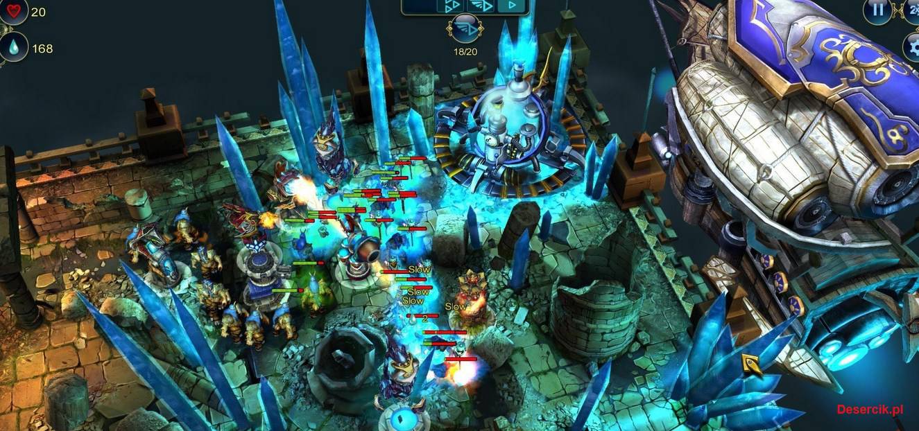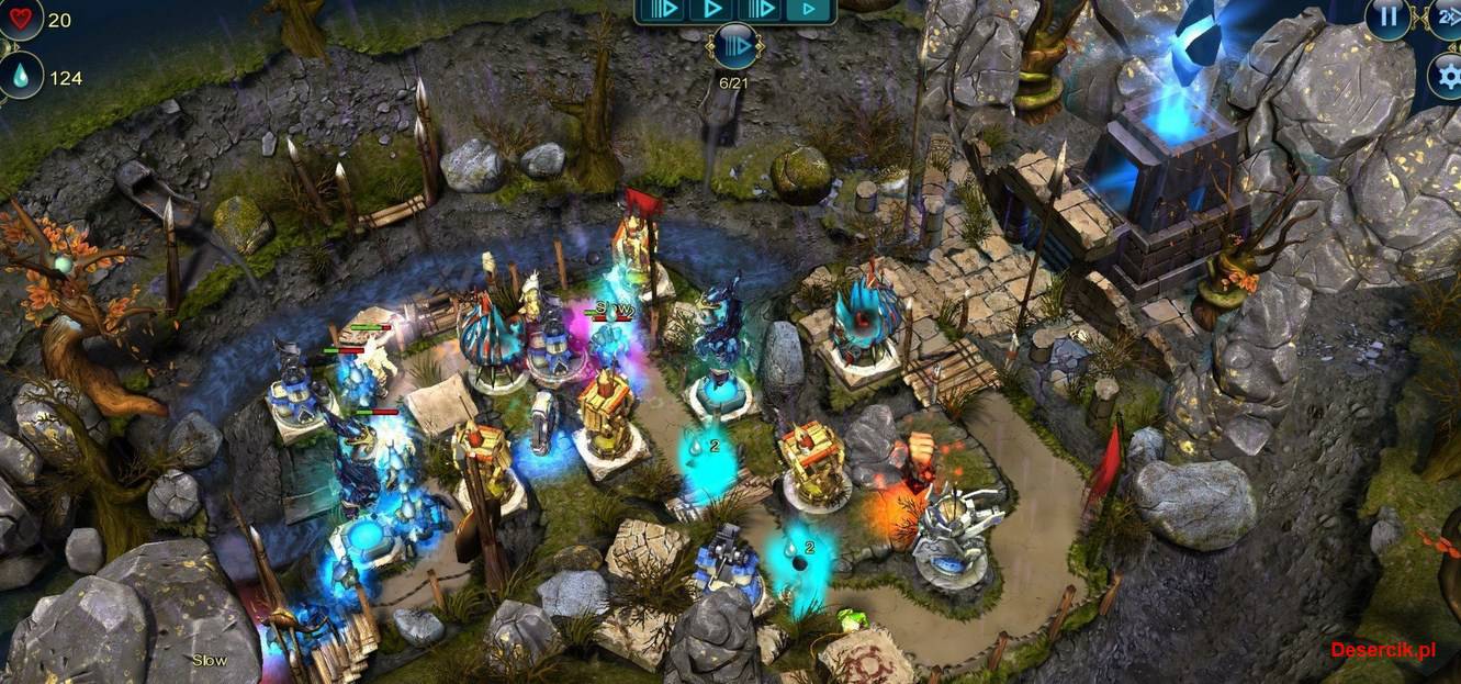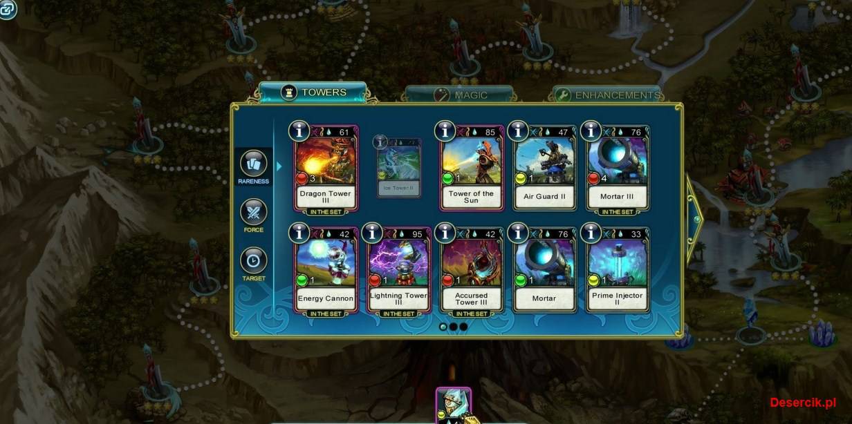 Jednak omawiana gra w gatunku tower defense wnosi coś nowego, otóż pojawiają się tutaj również kolekcjonerskie karty, które pozwalają nam korzystać z dodatkowych zaklęć, a osobiście naliczyłem ich na obecną chwilę około jedenaście. Karty pomogą nam także ulepszać działanie wieżyczek. Samym rodzai wieżyczek jest już ponad dwadzieścia i co więcej przy ulepszeniach mamy kolejne 25 poziomów w górę. Karty zdobywamy regularnie grając i talię do walki dobieramy tuż przed jej rozpoczęciem jednak musimy mieć świadomość, że przeciwnik nie podda się tak łatwo i pomimo wielu wieżyczek jak i posiadanej magii będzie ciężko dobrać coś co pokona każdego potwora.