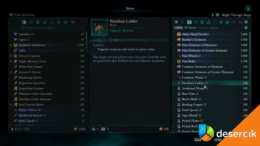 Dla przykładu: wszystkie bronie i zbroje, które znajdziesz w Świtobrzegu, będą miały jakość Zwykłą. Możesz je ulepszyć trzykrotnie przy użyciu lokalnych materiałów, ale aby wskoczyć do następnego poziomu jakości, potrzebujesz Rajskiego Pnącza – materiału upgrade’owego pierwszego rzędu.