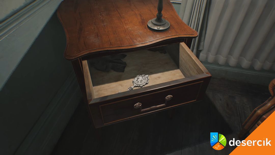 Na końcu korytarza, obok czerwonego krzesła, stoi stolik z szufladą. Podejdź i otwórz ją. W środku znajdziesz klucz z cherubinkiem. To niewielki przedmiot, ale ma ogromne znaczenie, bo pozwoli ci wreszcie wejść do pokoju 201.