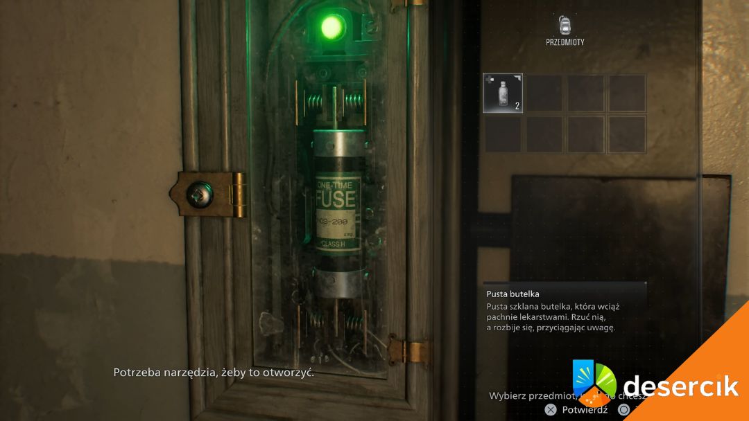Otworzy się dopiero po włożeniu dwóch sprawnych bezpieczników do skrzynki obok. Na ten moment działa tylko jeden, więc twoim głównym celem jest zdobycie drugiego i przywrócenie pełnego zasilania w tej części budynku.