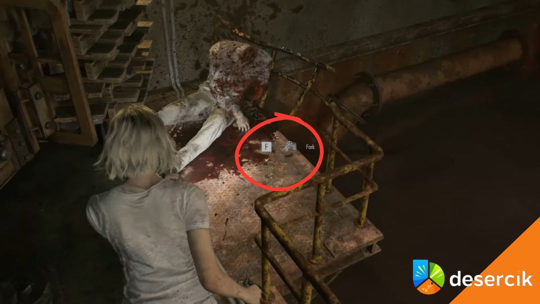 W przetwórni, na końcu pokoju, znajduje się drugi wózek widłowy i zwłoki po prawej stronie. Kluczyki do wózka widłowego leżą właśnie obok tego ciała – wystarczy je podnieść.