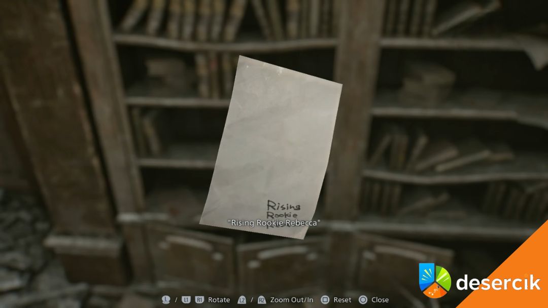 Zdjęcie Rebeki Chambers – otwórz książkę, aby znaleźć zdjęcie Rebeki. Odwróć je, a na odwrocie przeczytasz napis Rising Rookie Rebecca. To właśnie kod do teczki w R.P.D.: RRR.