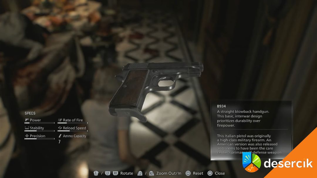 Obok stołu leży B934. Weź go, ale pamiętaj – amunicja jest bardzo ograniczona. Strzelaj tylko gdy musisz. Często lepiej postrzelić w nogę, przewrócić wroga i uciec.