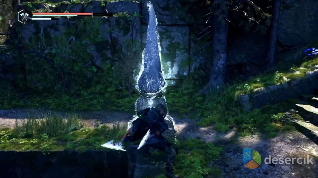 - Słupek 3: Wspinając się na wzgórze od drugiego słupka, skręć w drugą lewą odnogę ścieżki, gdzie znajdziesz uszkodzony słupek. Druga połowa leży na ziemi i nie zawiera symbolu, dlatego potrzebne są pozostałe słupki, aby uzupełnić brakujący filar.