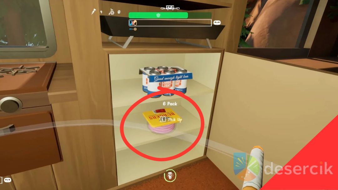 Burgery znajdziesz w środku kampera, zazwyczaj przyrządzone na kuchence, gotowe do spożycia. Po podniesieniu ich postać automatycznie je zjada – nie musisz wchodzić w żadne menu ani zarządzać ekwipunkiem żywności. Dodatkowo, w trakcie podróży można natknąć się na dodatkowe burgery na stacjach benzynowych czy miejscach odpoczynku, więc warto mieć oczy szeroko otwarte.
