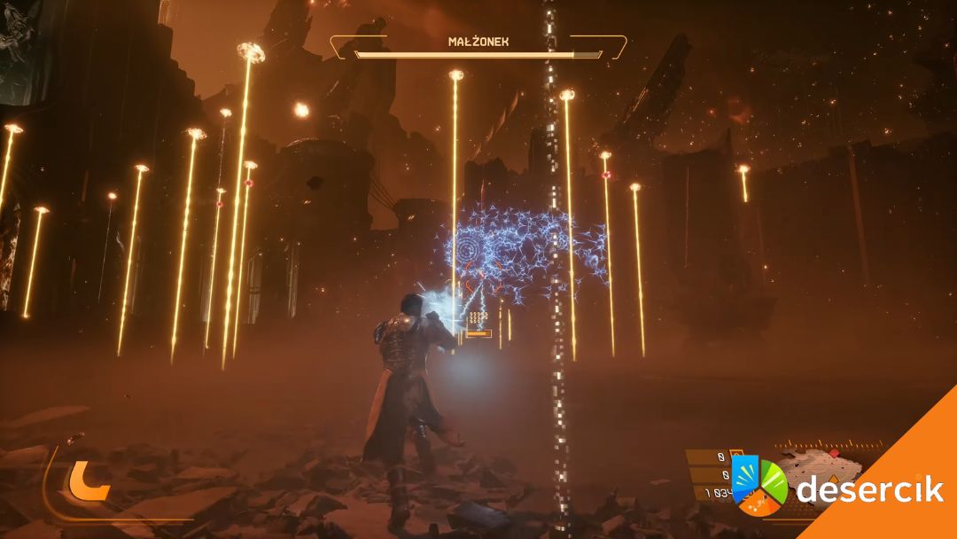 Podczas starcia przeciwnik wykorzystuje różne rodzaje ataków energetycznych. Niebieskie pociski możesz neutralizować przy pomocy tarczy, co stanowi ważną lekcję podstawowych mechanik defensywnych.