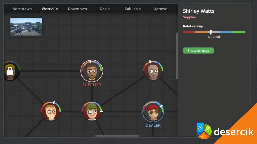 Dostęp do Westville uzyskasz poprzez rozwijanie postaci i wykonywanie głównego wątku fabularnego. Gdy tylko ten rejon stanie się dostępny, gra od razu daje ci nowe możliwości. Pojawia się nowy dostawca – Shirley Watts oraz kolejny dealer, a pseudo trafia do obiegu dokładnie w ten sam sposób co trawka, czyli przez system martwych skrytek.