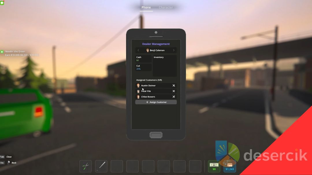 Do przypisania klientów używasz telefonu. Otwórz aplikację Dealerzy, a w zakładce Zarządzanie Dealerami zobaczysz informacje o gotówce, prowizjach, stanie magazynu i przypisanych klientach. Każdy dealer może obsługiwać do 8 klientów, więc użyj przycisku + Przypisz klienta, aby wybrać odpowiednie osoby z listy odblokowanych klientów. Warto przypisywać do dealera klientów z tego samego regionu, w którym go odblokowano – np. dla Benjiego najlepiej wybrać osoby z Northtown, takie jak Kyle Cooley, Chloe Bowers czy Peggy Myers.
