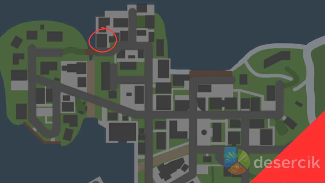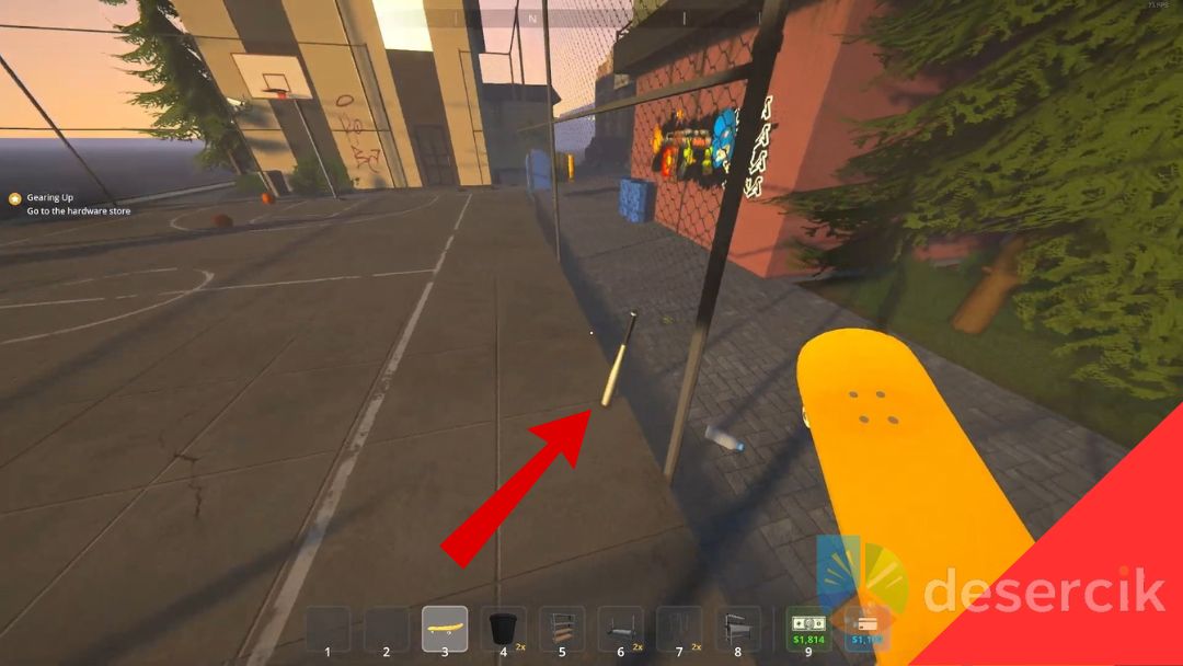 Kij leży przy ogrodzeniu boiska do koszykówki, które stoi na północ od motelu – twojej pierwszej bazy. Zejdziesz ze schodów przed motelem na drogę, przejdziesz ją i po drugiej stronie trafisz na ogrodzone boisko. Wejdź przez niewielką furtkę w południowo‑wschodnim narożniku, skręć w prawo i obok siatki znajdziesz kij oparty o płot. To bardzo wczesna i łatwo dostępna broń, więc warto mieć na nią oko od razu po rozpoczęciu rozgrywki.