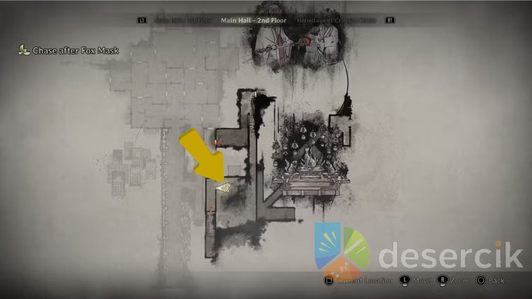Ten nowy obszar nosi nazwę Ermitaż Czerwonej Wody (Hermitage of Crimson Water). Idź w górę wzgórza, aż dotrzesz do dużego budynku, w którym na stole znajdziesz Agura no Hotei-sama – przedmiot wymagany do zakończenia „Fox’s Wedding”.