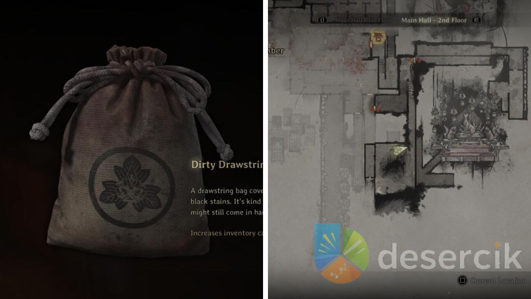 Trzeci upgrade znajdziesz podczas rytuału w świecie duchowym, tuż po dotarciu do domu Shu. Musisz tam wykonać trzy rytuały. Po ukończeniu dwóch z nich gra przeniesie Cię do korytarza w południowo-wschodniej części pierwszego piętra. Jeden z drzwi prowadzi z powrotem na główny poziom, a drugi na schody. Wspinając się, trafisz do dużego pokoju z kilkoma przeciwnikami i pękniętą podłogą. Obchodząc pomieszczenie dookoła, zauważysz torbę na półce – to właśnie Dirty Drawstring Bag, które doda kolejny slot do ekwipunku.
