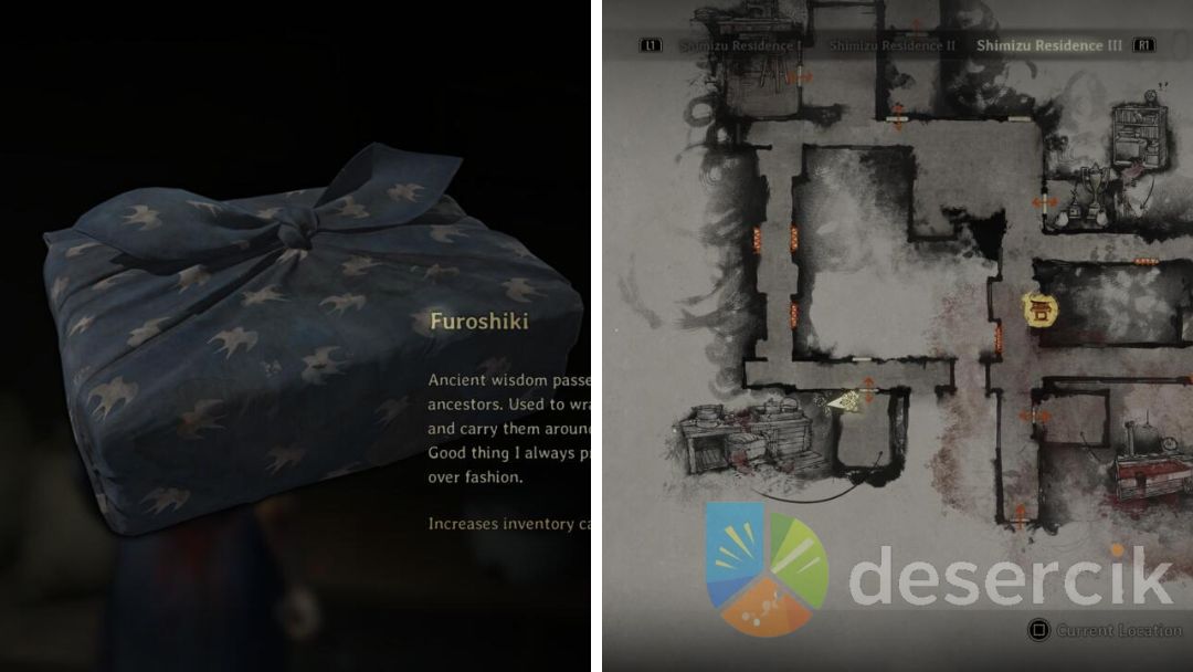 Kolejna okazja na powiększenie torby pojawia się podczas sekwencji w domu Hinako. Twoim zadaniem jest tam odnalezienie herbów, by odblokować drzwi, a mechanika polega na umieszczaniu kalendarzy na ścianie, co zmienia układ domu. Po wstawieniu drugiego kalendarza (w tym momencie powinieneś mieć już jeden herb) udaj się do południowo-zachodniej części domu. Na mapie miejsce to widnieje jako Shimizu Residence III. Właśnie tam znajdziesz Furoshiki, czyli kolejną torbę powiększającą ekwipunek.