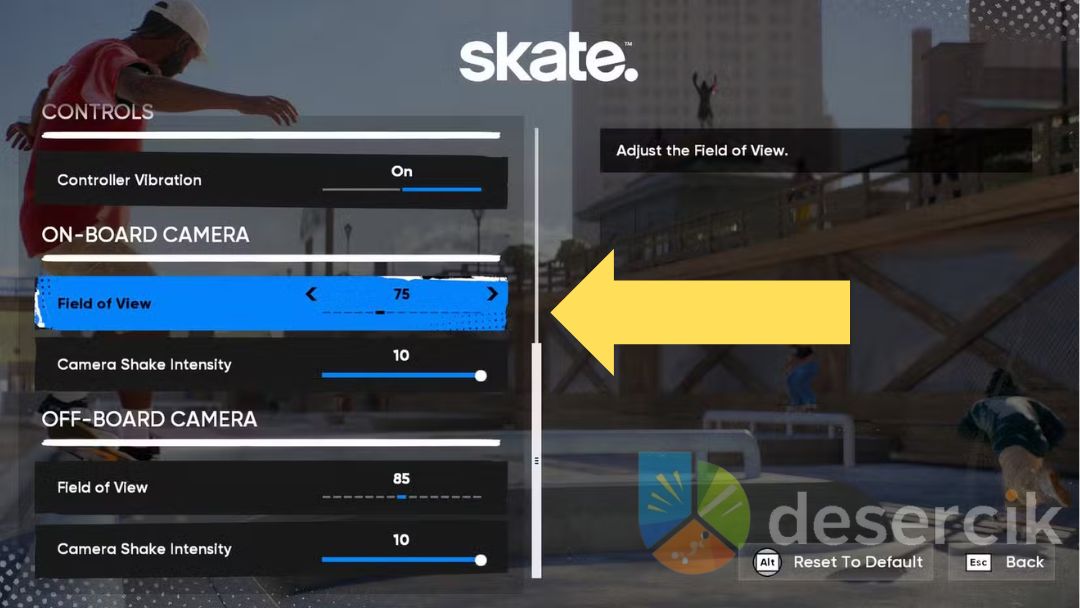 Najważniejszy parametr to Field of View (FOV), czyli pole widzenia. W Skate 4 możesz ustawić je w zakresie od +50 do +120, zmieniając co 5 jednostek. To daje sporo możliwości eksperymentowania i dopasowania perspektywy do własnego stylu jazdy.
