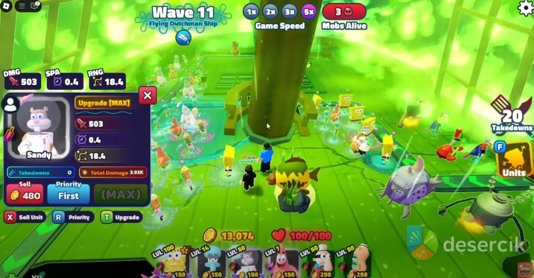 Bro, miałem dwie w pełni ulepszone Krusty Krabs i nadal hajsu było mało – ale nie zginąłem. Fala 25 – zero obrażeń, misja zaliczona.