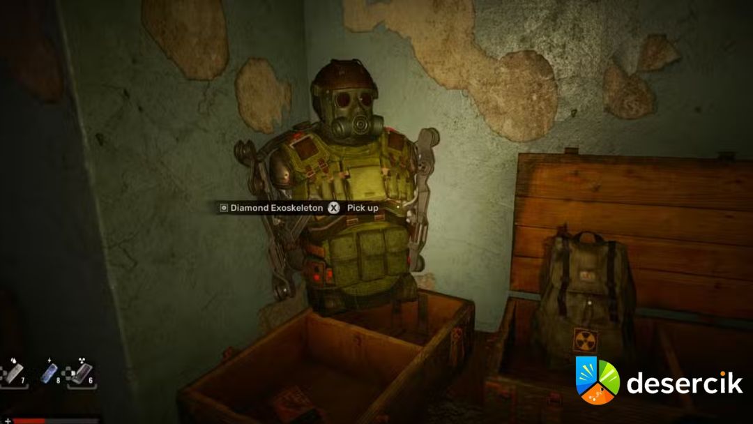 Pancerz znajduje się w regionie Prypeci, w kompleksie budynków tuż za Strumok Milk Shop. Zacznij od wyjścia z bazy Palace of Culture, skieruj się na południe i dotrzyj do sklepu mlecznego. Stamtąd podążaj w stronę kompleksu mieszkalnego, w którym czeka na Ciebie Diamentowy Egzoszkielet.