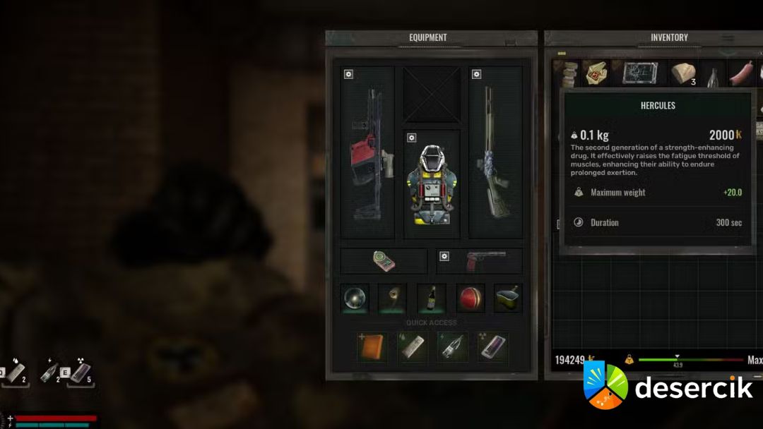 Na początku nasz bohater może nosić maksymalnie 80 kg. Stan obciążenia widoczny jest w prawym dolnym rogu ekranu, a każdy przedmiot ma swoją wagę – najcięższe są stroje i karabiny.