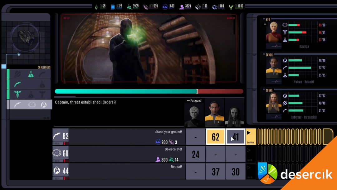 Misje poza statkiem to znowu klimat visual novel. Wybierasz członków drużyny i podejmujesz decyzje, które prowadzą do określonych rezultatów. Kluczowe jest dopasowanie postaci do zadania. Na przykład Chakotay sprawdza się w testach bojowych, a Tuvok w innych specjalizacjach.