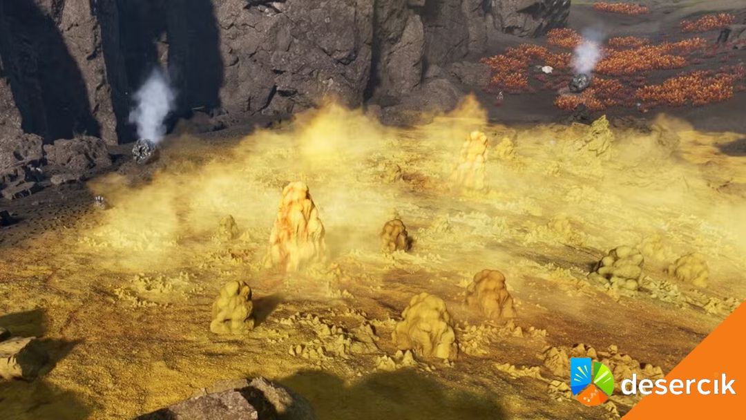 Ale uwaga – pole siarkowe wydziela gaz korozyjny, który powoli obniża Twoje zdrowie. Jeśli pozwolisz mu działać bez kontroli, Twój bohater zacznie tracić HP. Dlatego najlepszą strategią jest szybkie wejście, zebranie Sercowników i ucieczka zanim zacznie się robić niebezpiecznie.