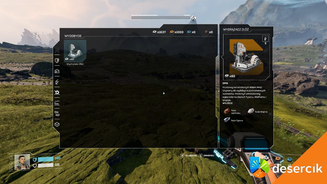 Na początku gry masz dostęp do kilku bazowych materiałów. Wśród nich znajdują się Tytan, Wolfram, Hel oraz Wapień. To właśnie z tych surowców powstaje ogromna część elementów potrzebnych do przetrwania i rozwoju.