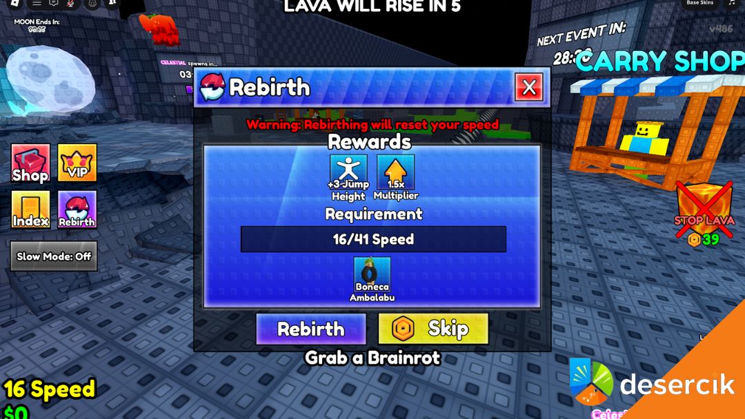 W Survive Lava for Brainrots system rebirth to absolutna podstawa progresu. Na pierwszy rzut oka boli. Resetujesz prędkość, tracisz to, co chwilę wcześniej farmiłeś, i zaczynasz znowu od 16 speeda. Ale w praktyce to najlepsza decyzja, jaką możesz podjąć, jeśli chcesz wejść na wyższy poziom gry.