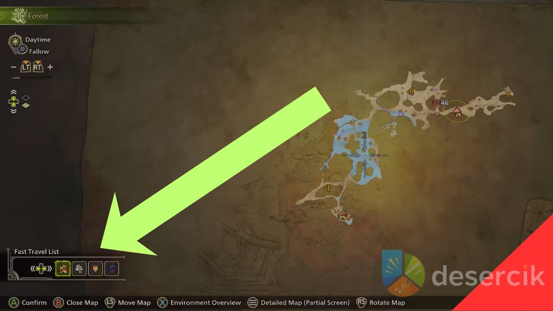 Możesz też otworzyć listę szybkiej podróży (Fast Travel List) – w tym celu wejdź w pełną mapę i naciśnij w prawo na D-padzie. Wyświetli się wtedy pełna lista wszystkich obozów i miejsc, które odkryłeś, bez konieczności ich szukania na mapie. To szybki sposób, by przenieść się tam, gdzie akurat chcesz polować.