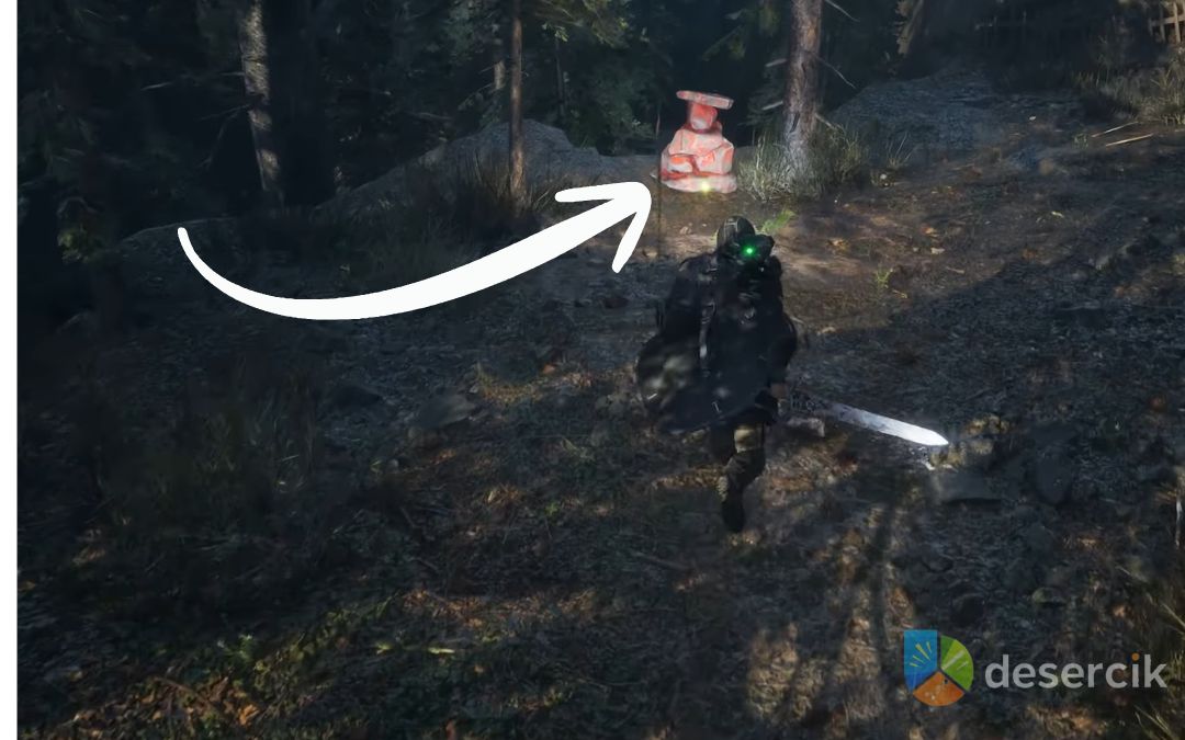 Idź w lewo od przewróconego drzewa, a tuż przed sobą zauważysz stos kamieni z żółtym połyskiem na szczycie.