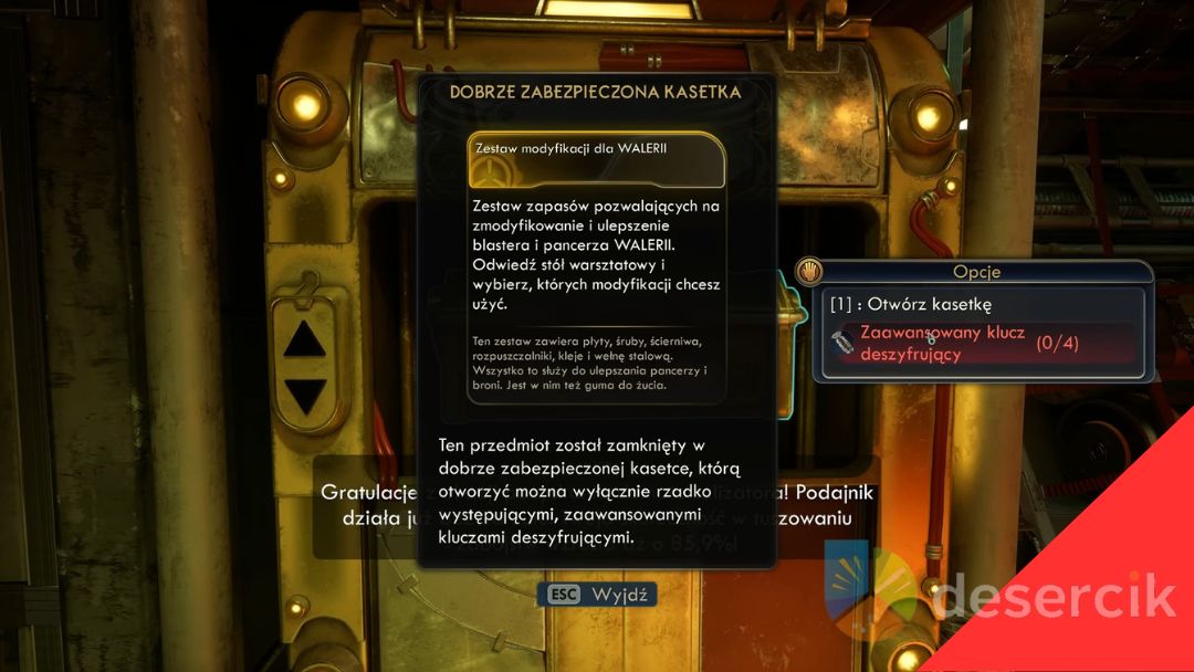 Aby dostać się do środka, potrzebujesz Zaawansowany Klucz Deszyfrujący. To dość rzadka rzecz, którą można znaleźć w świecie gry lub kupić u sprzedawców. Trzeba się trochę naszukać, bo nie leżą one na widoku – często chowają się w zamkniętych pojemnikach, skrzynkach, czy w zakamarkach lokacji.