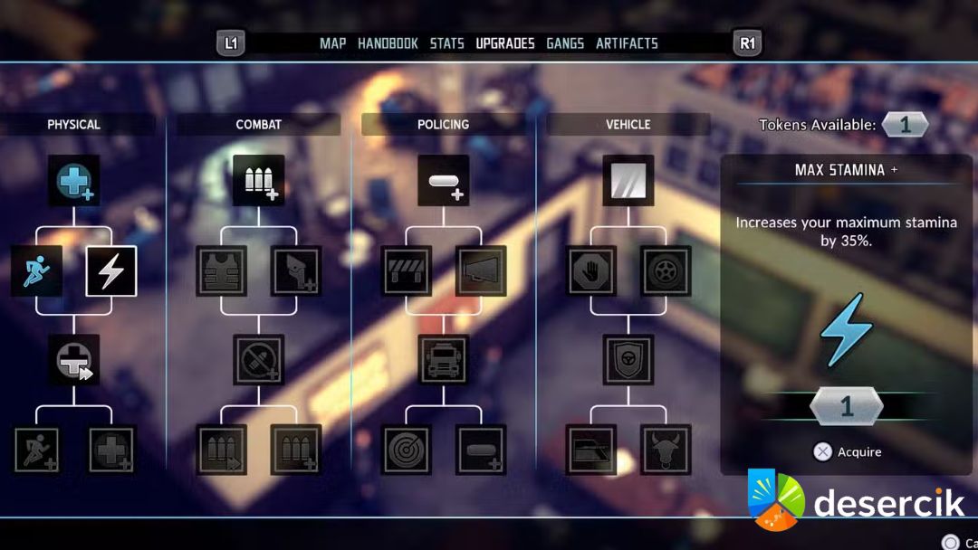Żeby stamina nie była wiecznym problemem, warto rozwijać ją od początku. Tokeny ulepszeń wpadają za typową policyjną robotę: aresztowania, mandaty, uspokajanie sytuacji. Potem w menu umiejętności można je wydać na to, co naprawdę pomaga w terenie. Kategorie są cztery, ale cała zabawa z wytrzymałością siedzi w sekcji fizycznej. Tam znajdują się ulepszenia podnoszące maksymalną energię, spowalniające jej spadek albo skracające czas regeneracji.