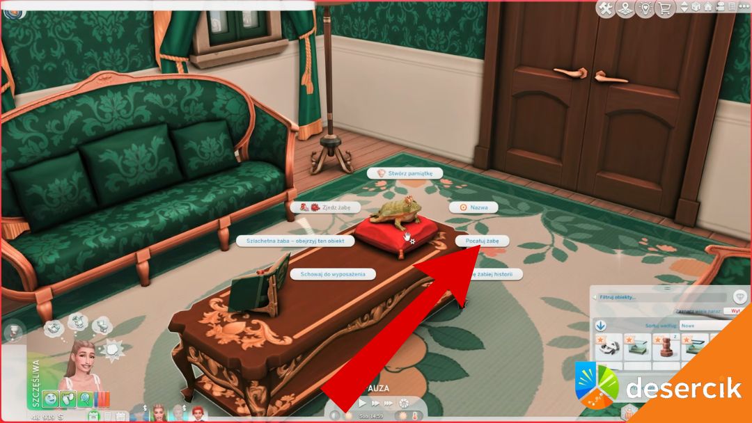 Kiedy już masz Szlachetną Żabę w ekwipunku, magia naprawdę się zaczyna – wystarczy wybrać opcję „Pocałuj Żabę”, aby żaba zmieniła się w Simową postać. Płeć nowego Sima zależy od preferencji romantycznych Twojego Sima – jeśli woli kobiety, pojawi się żeńska postać, jeśli mężczyzn, to odpowiednio męska, a jeśli nie ma preferencji, może być jedno lub drugie. To wspaniały sposób, żeby wprowadzić do gry trochę losowości i unikalnych historii.