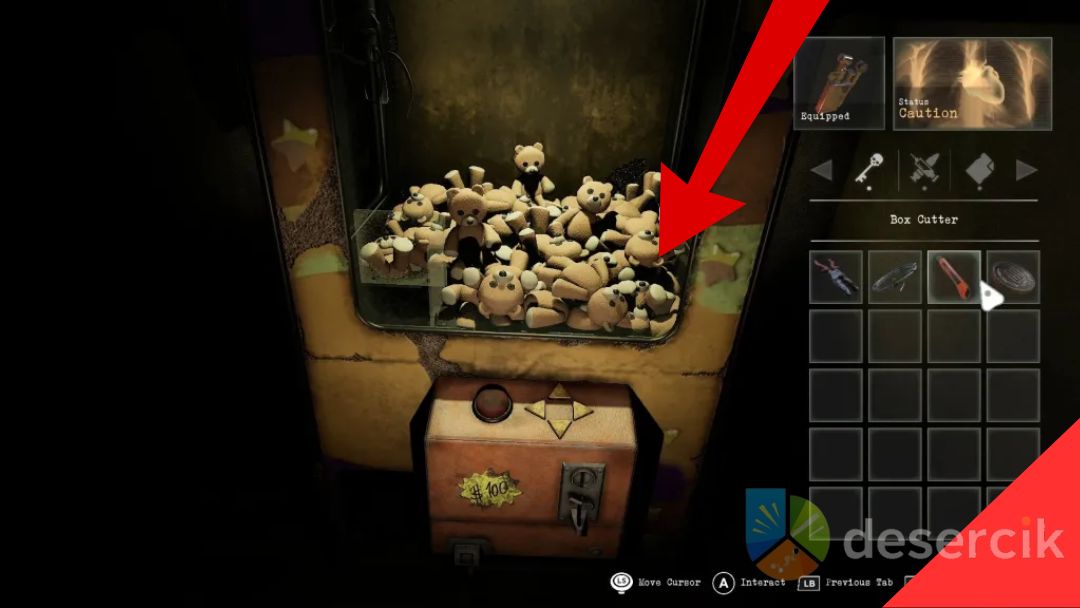 Włóż zdobyte Monety do automatu i zagraj. Steruj strzałkami i czerwonym przyciskiem, aż ustawisz chwytak nad pluszowym misiem bez oka – to właśnie on jest ważny. Gdy uda ci się go złapać, wejdź w ekwipunek i użyj noża Box Cutter, żeby rozpruć maskotkę. W środku znajdziesz złoty pierścień (Gold Ring) – kluczowy przedmiot do zakończenia tej zagadki.