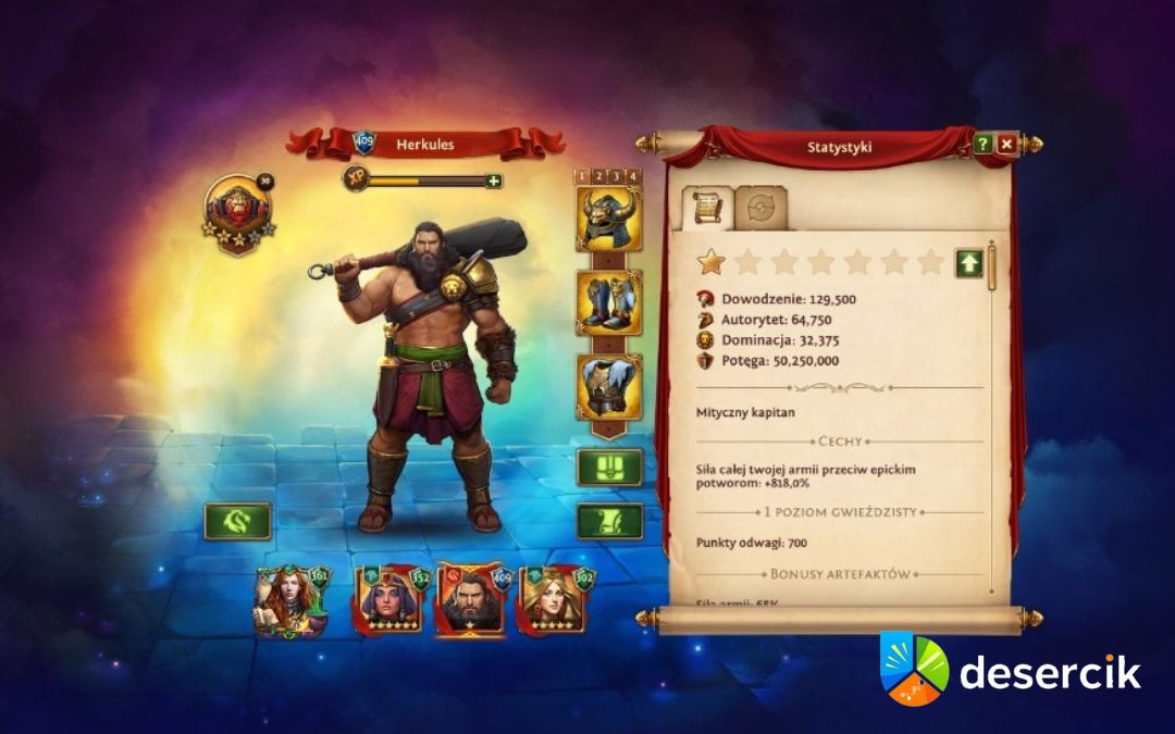 Jednak z Herculesem na czele, Twoja armia zyskuje gigantyczne bonusy. Działa on według prostej zasady: na każdym poziomie daje ×2 bonus do siły. Dla przykładu – mając go na poziomie 216, otrzymujesz aż +432% mocy bojowej dla całej armii podczas starć z epickimi przeciwnikami.