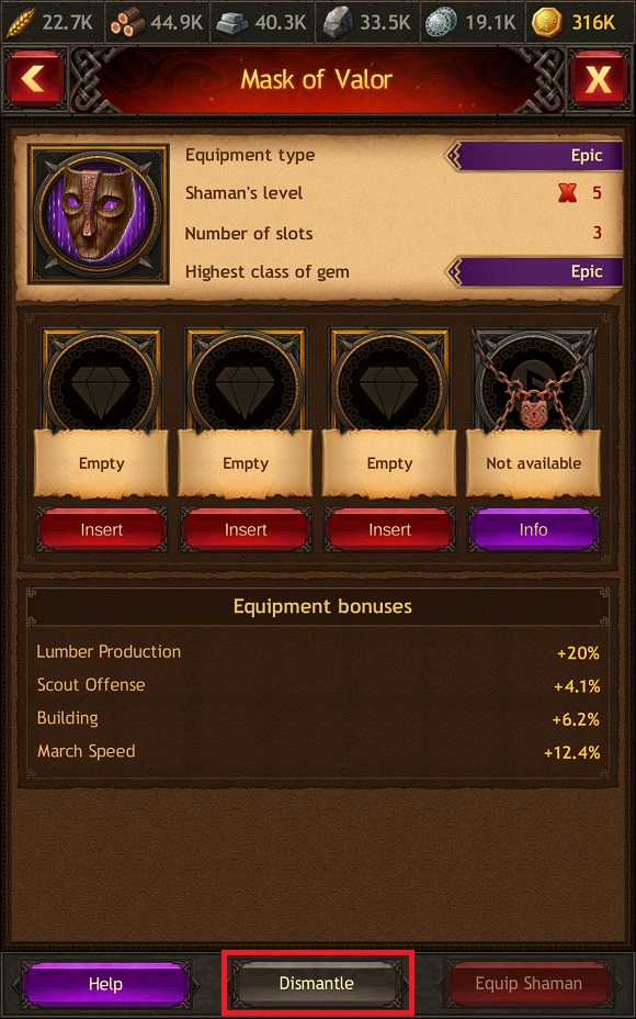 - Kliknij ikonę aktywnego Szamana, a następnie kliknij odpowiedni slot. Wybierz sprzęt, który chcesz zdemontować, i naciśnij przycisk „Demontaż” (Dismantle).