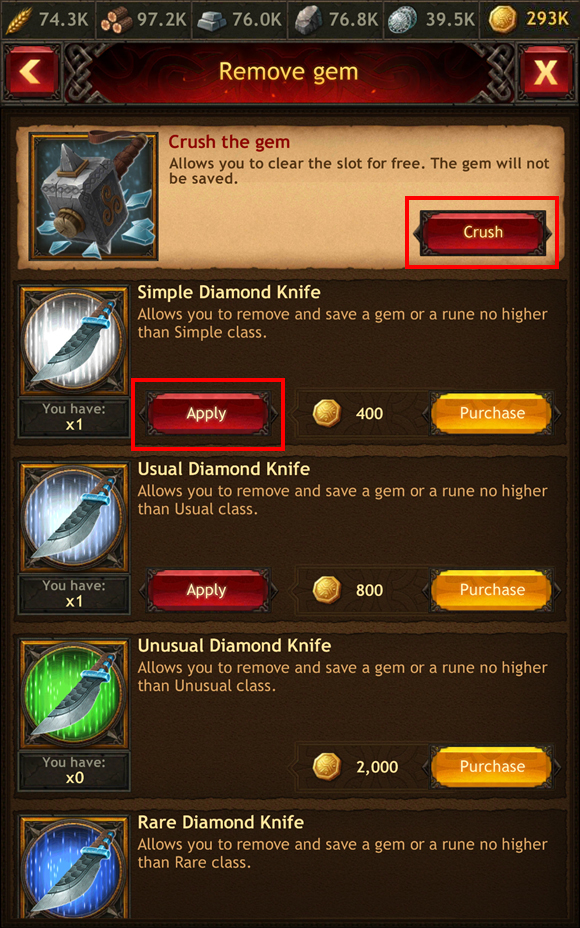 - Poprzez zastosowanie przedmiotu Diamentowy Nóż. W takim przypadku klejnot jest zwracany i można go ponownie użyć. Diamentowy nóż jest produktem jednorazowego użytku. Aby usunąć klejnot z określonej klasy, potrzebujesz przedmiotu Diamentowy nóż tej samej klasy lub wyższej. Możesz go kupić w sekcji Bonusy w sklepie z przedmiotami.