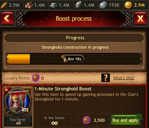 Pamiętaj, że jeśli proces transformacji zasobów się rozpoczął, nie można go anulować. Jednak każdy członek klanu może przyspieszyć ten proces, korzystając ze specjalnego przedmiotu „Wzmocnienie twierdzy”.
