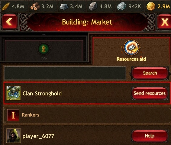 Każdy członek Klanu może wysłać zasoby do Twierdzy Klanu w celu dalszej transformacji, otwierając budynek Rynku w Mieście i wybierając Twierdzę Klanu jako odbiorcę.