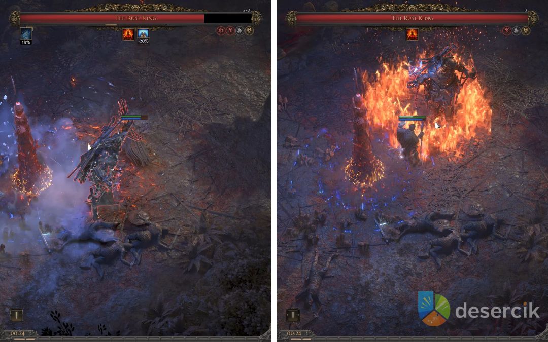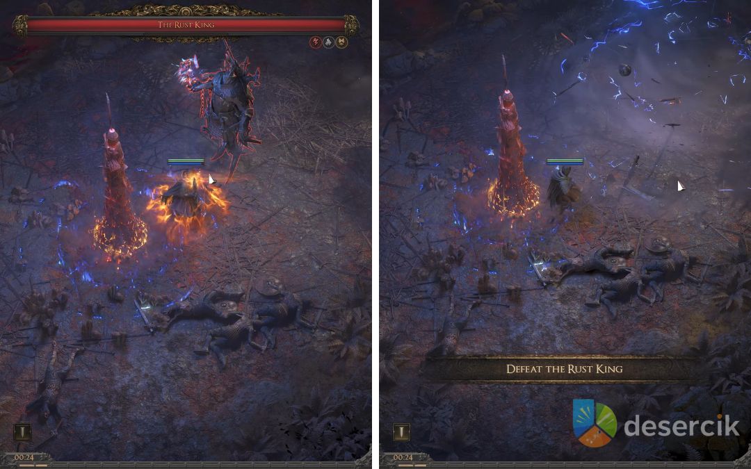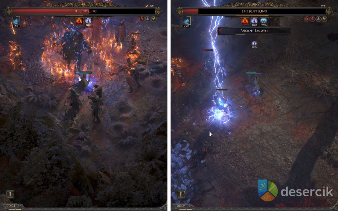 - The Rust King przywo艂uje grup臋 Ancient Ezomyte, kt贸re otaczaj膮 gracza i mog膮 szybko zwi臋kszy膰 liczb臋 przeciwnik贸w na polu walki.