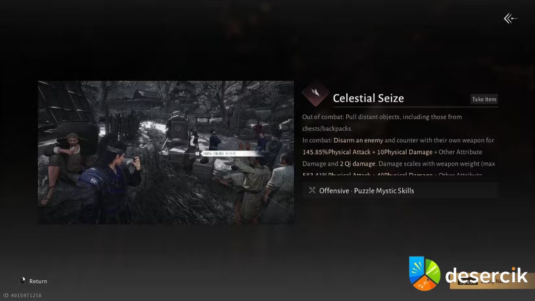 Zamiast robić mu aferę, Qiu Yuehai proponuje coś innego: uczy Cię Celestial Seize, żebyś mógł mu zdalnie wyrwać buteleczkę z oszustwem. W tym fragmencie misji skill sam wskakuje w pierwszy slot tajemnych umiejętności, więc po prostu wciskasz odpowiedni przycisk, celujesz w fiolkę i pyk – po sprawie.