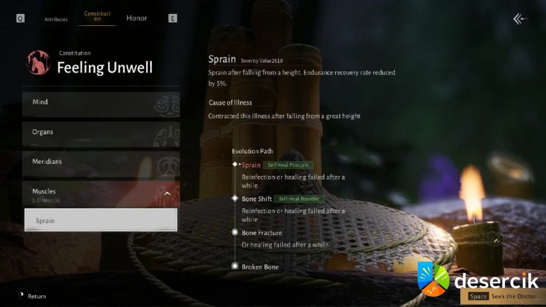 Choroby i kontuzje wpływają na różne części ciała: Mind, Organs, Meridians, Muscles. Na przykład zwykłe skręcenie wpływa na Muscles, zmniejszając tempo regeneracji Endurance o 5%.