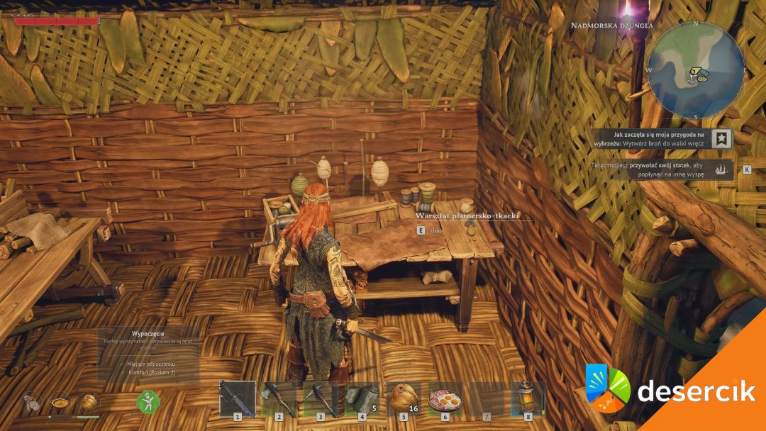 Gruba tkanina jest jeszcze stosunkowo prosta do ogarnięcia, ale wymaga chwili dość żmudnej, powtarzalnej pracy. W praktyce chodzi o zbieranie włókien roślinnych, które znajdziesz w krzakach, trawie i paprociach, szczególnie w rejonach Nadbrzeżnej Dżungli. Gdy uzbierasz trzy takie włókna i wrzucisz je do Warsztatu, dostajesz jedną sztukę materiału potrzebnego do craftingu butów jak i innych elementów odzieży pirata. Na tym etapie gra zaczyna już delikatnie uczyć, że wszystko ma swoje etapy i nic nie powstaje „od razu”.
