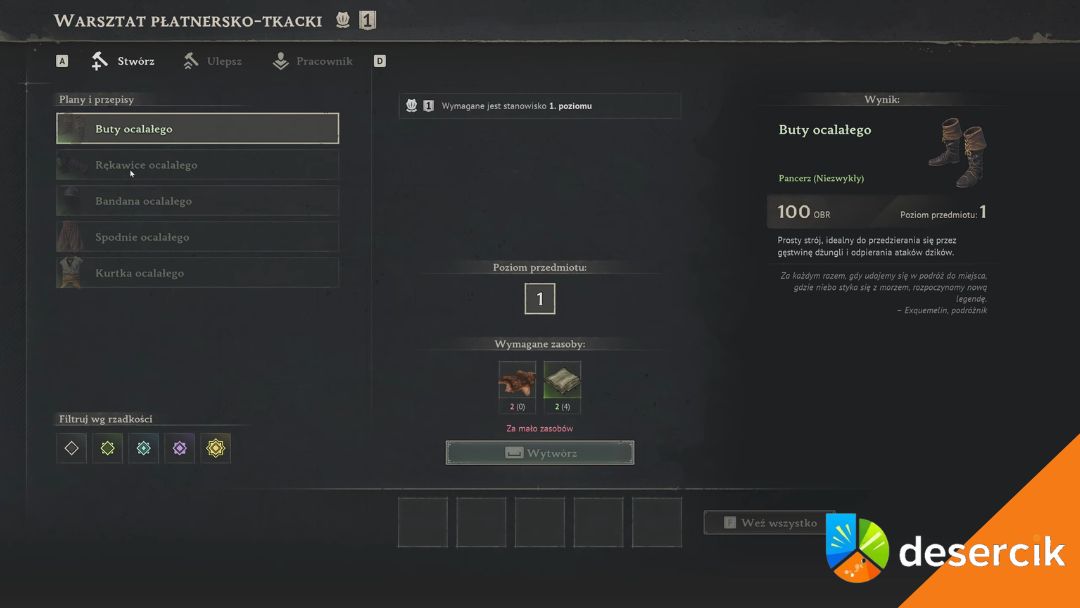 Gdy wszystko jest gotowe, sam przepis nie jest już szczególnie skomplikowany. Wystarczą dwie sztuki niewyprawionej skóry i dwie sztuki grubej tkaniny. Zbierasz materiały, podchodzisz do warsztatu i tworzysz Survivor’s Boots, czyli Buty Ocalałego.