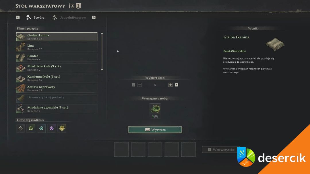 Na początku wszystko kręci się wokół zbierania prostych materiałów, ale tutaj zaczyna się pierwsze poważniejsze spięcie z systemem craftingu. Trzeba przygotować dwa różne zasoby, które wymagają zupełnie innych działań. Z jednej strony masz Grubą tkaninę, czyli coś, co robisz z roślin, a z drugiej Niewyprawioną skórę, które wymaga już walki z dzikami.