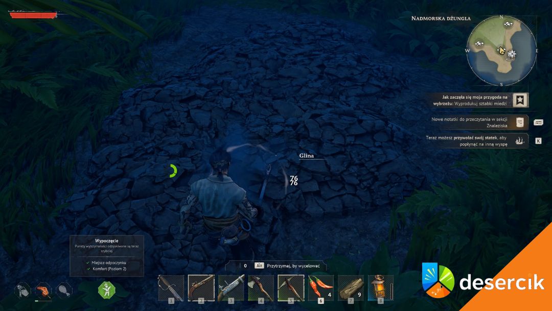 Po otwarciu mapy (klawisz M) przybliż ją maksymalnie. Zwróć uwagę na kolor piasku. Tam, gdzie przechodzi z jasnego beżu w ciemniejszy odcień, bardzo często znajdują się złoża gliny.