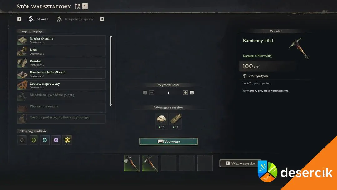 Przepis jest prosty: 3 kamienie i 3 drewna. Drewno zbierasz głównie z leżących kłód, a kamień znajdziesz praktycznie wszędzie.