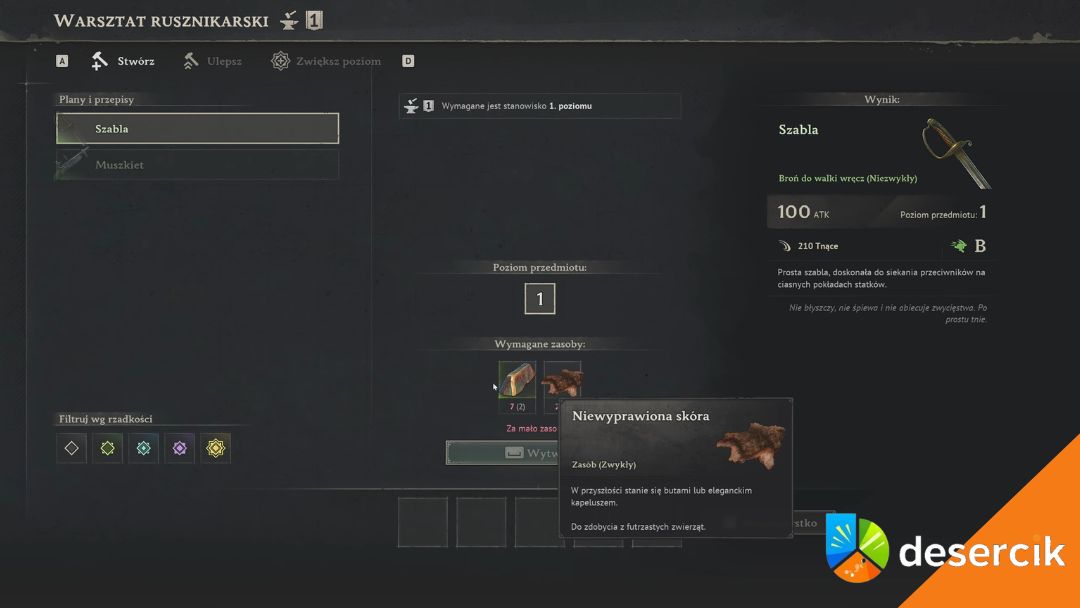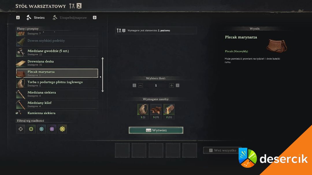 Kolejny poziom to plecak marynarza, ale tutaj gra zaczyna trochę mieszać. Widzisz przepis, masz materiały… a i tak nie możesz go zrobić. Powód jest prosty: za niski poziom stołu rzemieślniczego. I teraz ważna rzecz, której gra nie tłumaczy wprost – tu nie ma przycisku ulepszenia.