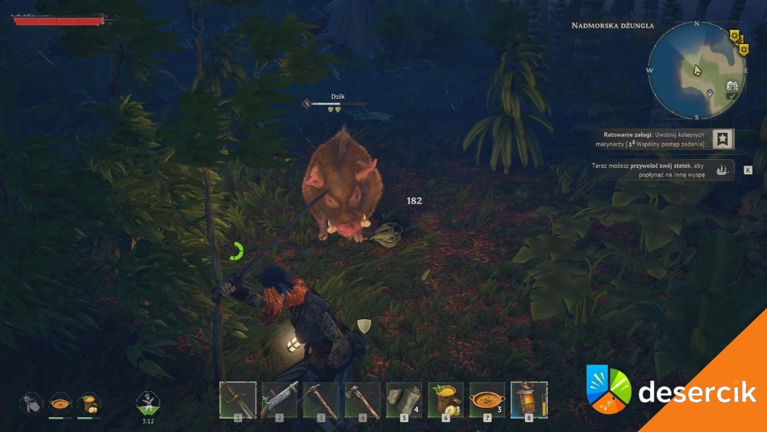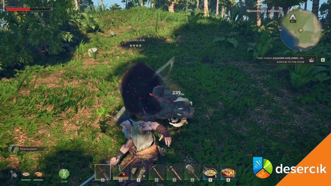 Źródło jest oczywiste: dziki. I tu zaczyna się problem, bo na pierwszej wyspie jest ich mało. Czasem trafisz jedną grupkę i tyle. Najlepiej szukać ich w głębi wyspy, nie przy brzegu. W lasach trafisz na lochy i dziki – to najłatwiejsze cele. Mają proste ataki wręcz, więc nie sprawiają dużego problemu.