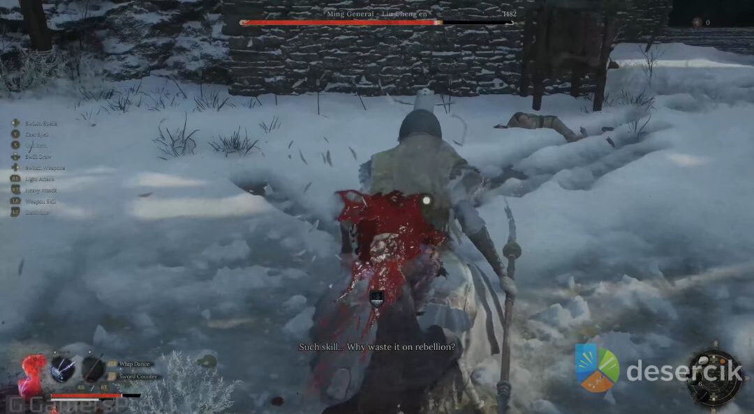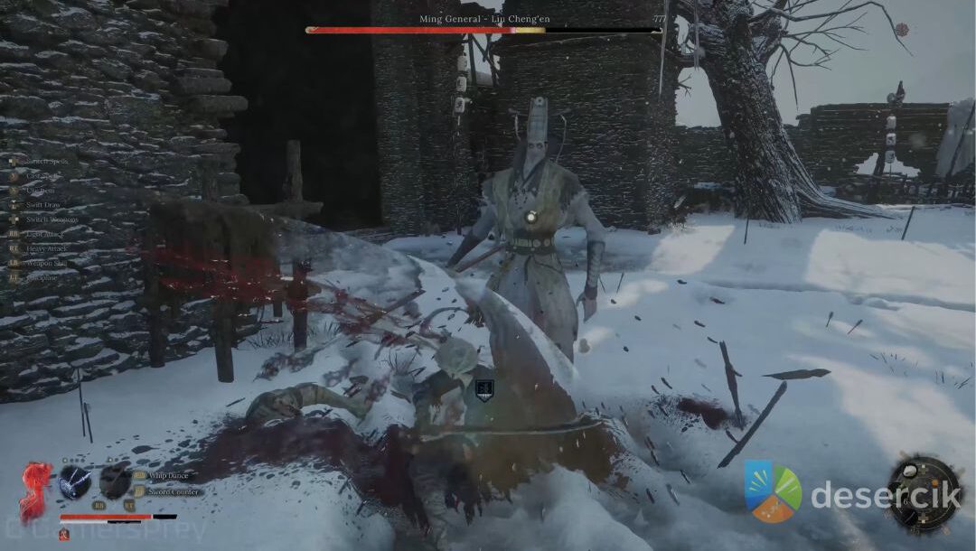 - Obroty mieczem: Liu Cheng’en wyskakuje w twoją stronę, wykonując obrót mieczem w powietrzu, a po wylądowaniu kontynuuje dwoma szybkimi obrotami. Te ataki są bardzo szybkie, więc wykonaj uniki wcześniej, niż wydaje ci się, że jest to potrzebne, aby uniknąć obu ciosów.