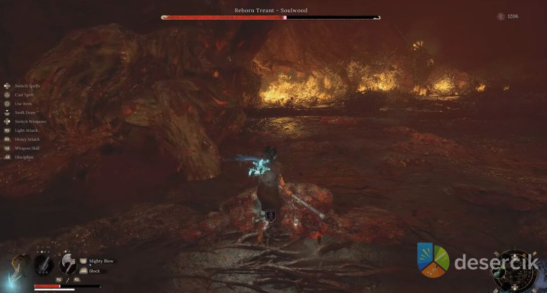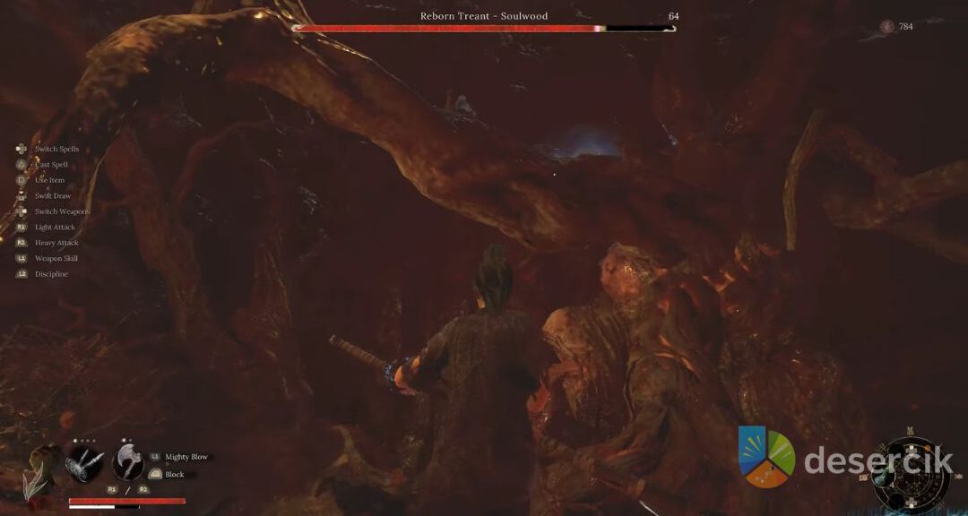 - Uderzenie ręką: Soulwood atakuje swoją drewnianą kończyną w miejscu, gdzie stoisz. Po uderzeniu ręka na chwilę utknie w ziemi, co daje Ci szansę na zadanie obrażeń tej części ciała.